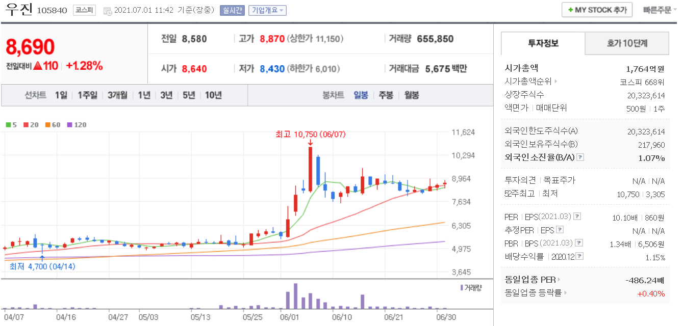 매수이유 : 한미정상회담에서 소형원자로에 대한 이야기가 나왔고 관련주라고 생각해서 매수했다. 하지만 너무 조급한 마음에 비싼 가격에서 매수하고 말았다.